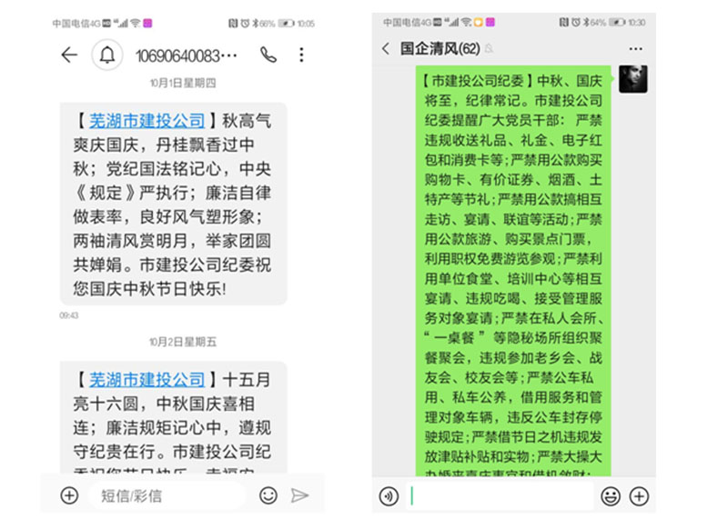 發(fā)送廉政短信。中秋國慶前期和期間,公司紀(jì)委向全體干部員工及控股企業(yè)領(lǐng)導(dǎo)班子成員累計發(fā)送廉政短信348條次,通過企業(yè)微信群累計發(fā)送廉政提醒14次,在表達(dá)節(jié)日祝福的同時,提醒廣大領(lǐng)導(dǎo)干部嚴(yán)格遵守廉潔自律各項規(guī)定,繃緊廉潔自律這根弦,筑牢拒腐防變這道防線。