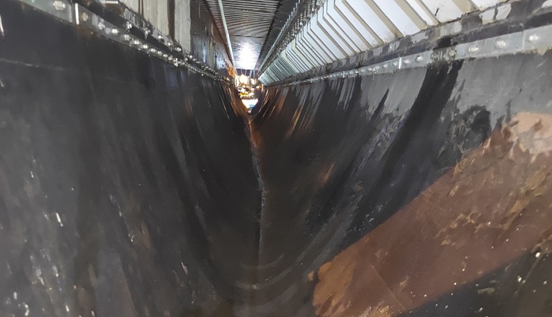 蕪湖長江三橋主橋0#、5#墩處采用最大伸縮量為1200mm的梳齒形伸縮縫,齒間距約50mm,通過橡膠止水帶收集雨水后排至兩側(cè)雨水斗進入雨水系統(tǒng)。自三橋通車以來,車輪及雨水裹挾泥沙由梳齒間隙進入伸縮縫,止水帶內(nèi)存有不少泥沙和雜物。隨著時間的推移,止水帶內(nèi)積沙積泥載荷增大,將會對正下方高鐵運行產(chǎn)生威脅。為及時消除安全隱患,大橋公司路產(chǎn)安全部養(yǎng)護人員組織外協(xié)單位多次前往現(xiàn)場確定清理方案及安全防護措施,并在公司領導帶領下及時對接鐵路蕪湖工務段,申請高鐵運行天窗期開展專門清理工作。